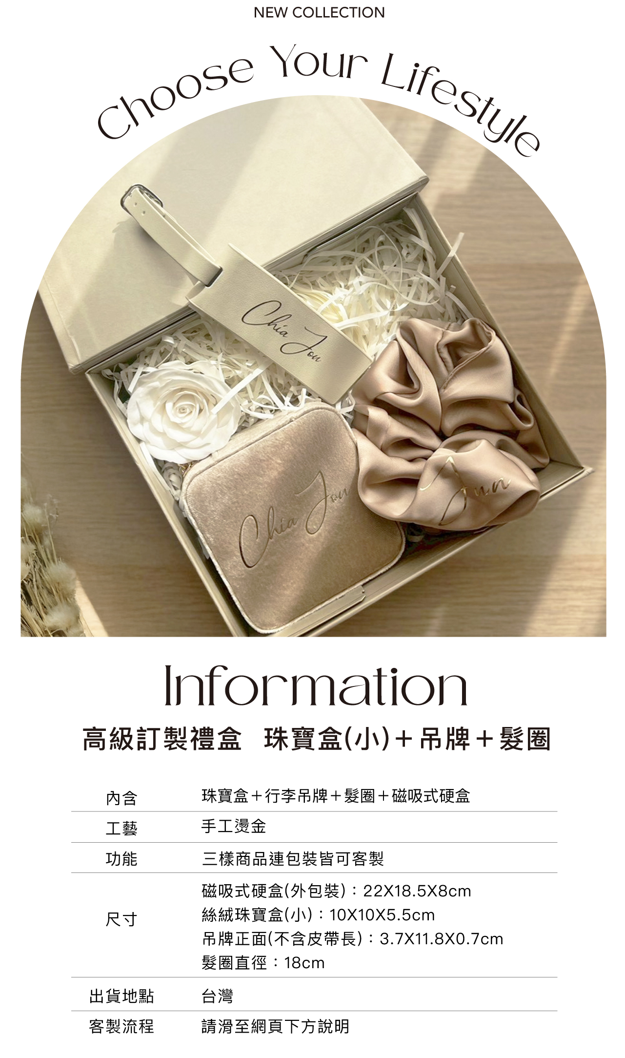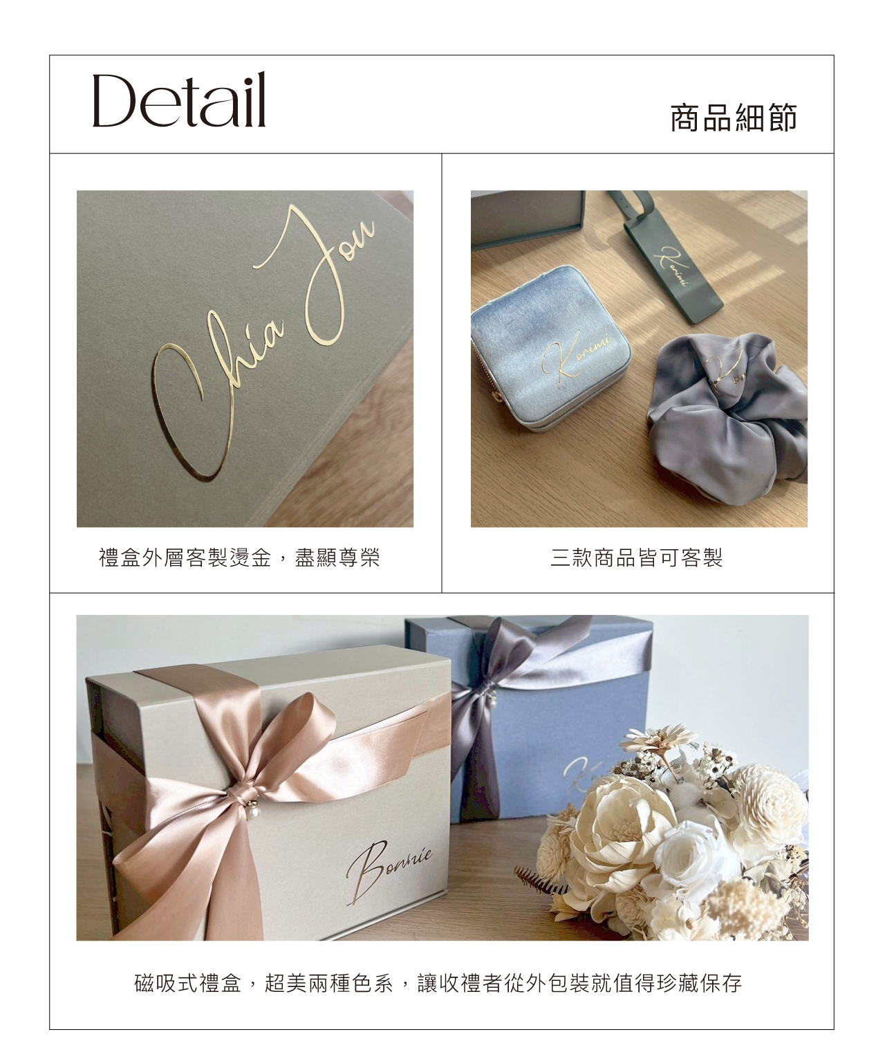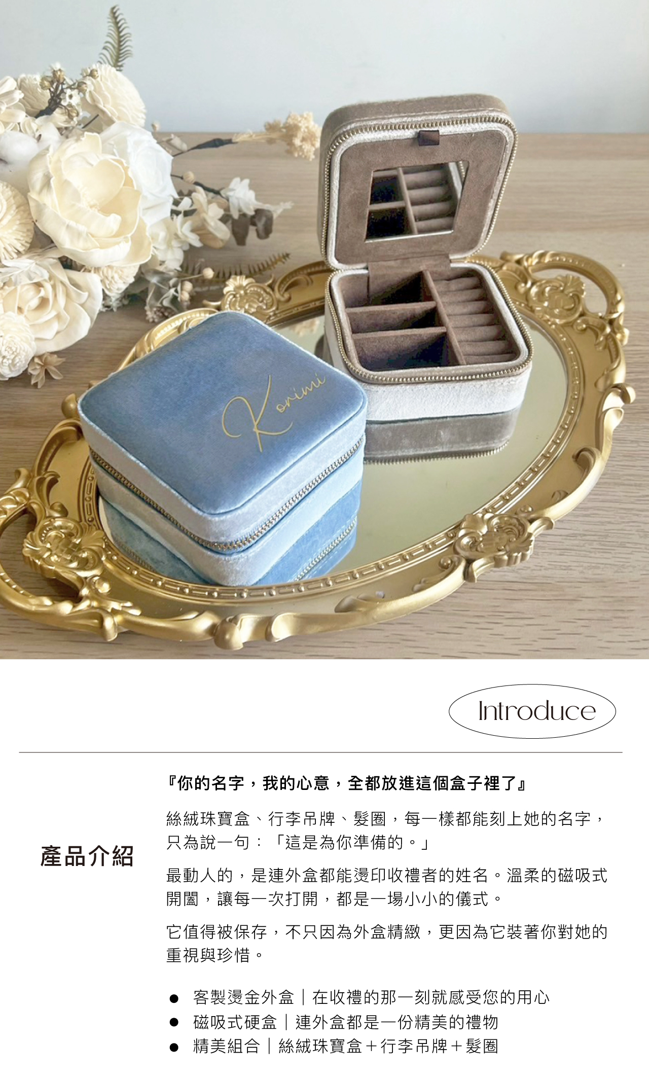 【高級客製磁吸盒】 絲絨珠寶盒(小)+行李吊牌+髮圈 三件組禮盒